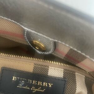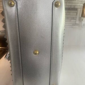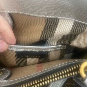 The Burberry Silver Satchel features a striking metallic finish and a structured silhouette, making it a standout accessory. Its sophisticated design is enhanced by unique fringe detailing, offering a blend of elegance and playful charm.