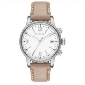 Stainle steel case with a taupe leather strap. Fixed stainle steel bezel. White dial with luminous silver-tone hands and index hour markers. Arabic numerals mark the 6, 9 and 12 o'clock positions. Minute markers around the outer rim. Luminescent hands and markers. Date display at the 3 o'clock position. Quartz movement. Scratch resistant mineral crystal. Pull / push crown. Solid case back. Case diameter: 38 mm. Round case shape. Band width: 20 mm. Tang clasp. Water resistant at 30 meters / 100 feet. Casual watch style. Burberry White Dial Taupe Leather Ladies Watch BU7822.