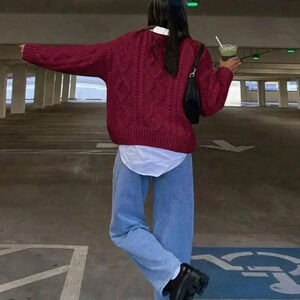 Burgundy Casual Women's Round Neck Cable Knit Long Sleeve Sweater