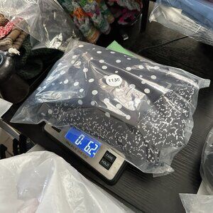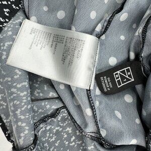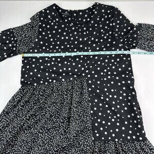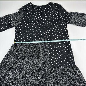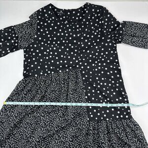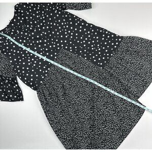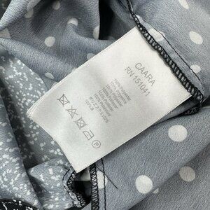 CAARA X Rent The Runway size small dress, it is a Millazo shift style, polka dot black and white contrasting print, short bell sleeves, crew neckline, above the knee length, lightweight satin fabric, hidden pockets, asymmetrical swingy hem, back zip closure. Care dry clean. Materials 100% polyester. Condition preloved very good as shown in pictures. Please preview measurements to ensure fit. Size 6 dress form used in photos. MFSR $145.00