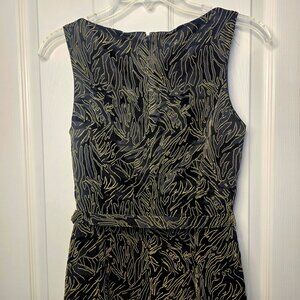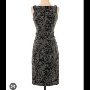 Super cute and modern sheath dress. Black geo print, boat neck, sleeveless, concealed back zipper, matching belt. Good Condition, worn only twice.