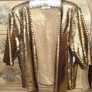Stunning! This gold, sequined, lightweight, lined, jacket is in PERFECT condition! No missing sequins, no tears or holes in lining. Paired with a black skirt or pants, and it will be perfect for any dressy occasion, or pair with jeans for a fun evening out!