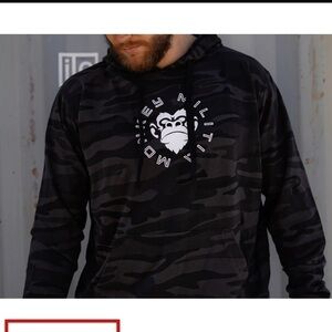 Soft camo hoodie with Monkey Militia logo on front.