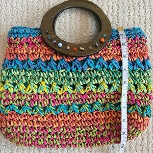 This bag is a multicolored beachy beauty! Hand crocheted from Toyo straw with two beautiful wooden circular handles featuring bead details. Perfect pairing for a sundress or cutoffs. Easy going, fresh and youthful style.