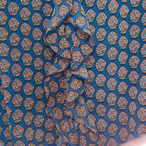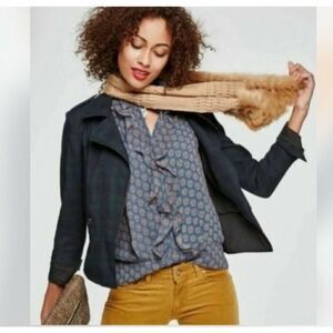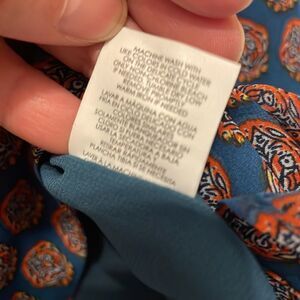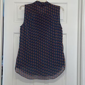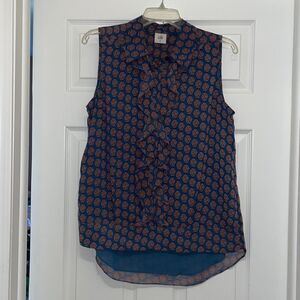CAbi Medallion Reign Sleeveless Ruffle Front Blouse, size medium. Excellent used condition. Pretty teal lined blouse with orange accents. Care & content tags in photos.