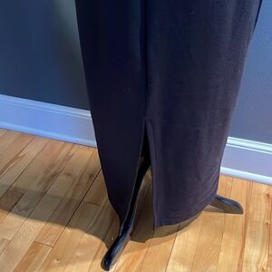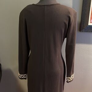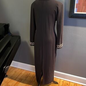 CDC gold bead diamond pattern bodice & cuffs knit maxi. Crew neckline. Pullover. Center back hem slit. Polyester/cotton/spandex blend. Size 12. Excellent condition. Nonsmoking home.