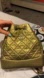 Luxurious gold quilted backpack with elegant chain straps. Perfect for any occasion.