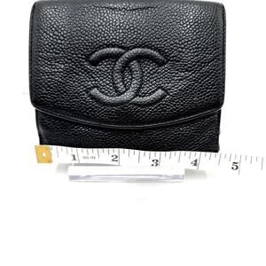 100% AUTHENTIC CHANEL. 100% LAMBSKIN BLACK CAVIAR VINTAGE BI-FOLD WALLET WITH COIN POUCH. 6 CARD SLOTS. 1 BILL COMPARTMENT AND SNAPPED COIN HOLDER. IN VERY GOOD CONDITION