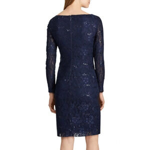 This is a Chaps navy lace sheath dress in size 6 for women. The dress features a solid pattern with sequin accents, long sleeves, and a round neckline. It is designed in a knee-length style, perfect for formal or semi-formal occasions. The fabric is lace, adding a touch of elegance to the overall look. This dress offers a flattering silhouette and a chic option for various events.
