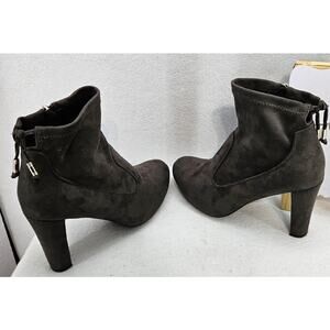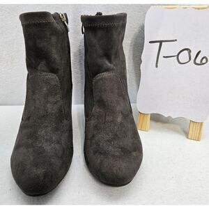 C&M gray, faux suede, heeled bootie with a tie at the back of the ankle, size 8.5