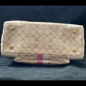 Exterior Coach Coated Signature Striped Fabric. Leather Trim. Brass Hardware. Zip Top Closure. Turn Lock Front Pocket. Vibrant Pink Lining. Exterior zipper pocket. Interior zip pocket and 2 slip pockets. Feet on bottom. This bag is in beautiful condition but as with any vintage bag it is gently used with some stains on interior fabric. And some wear on corners. A true collectors vintage find!!