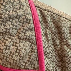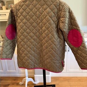 SUPER CUTE COACH COAT. 70% NYLON 30% POLY. LEATHER LINING AND ELBOW PATCHES. QUILTED. @ 21” L BACK A LITTLE LONGER. ARM @19”