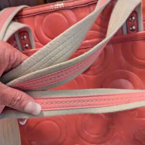 Carry all of your essentials in this Coach 16977 Rare Rose Signature Patent Leather Tote Travel Diaper Bag.
