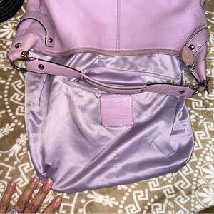 Inside, the bag is lined with purple fabric and features inner and outer pockets, as well as an organizer. The bag is lightweight and easy to carry, making it ideal for travel. The bag measures 14 inches in width, 10 inches in height, and 3 inches in depth, making it a medium-sized bag. It is finished with the iconic COACH logo and is sure to make a statement wherever you go. Preowned with minimal flaws . Nice bag