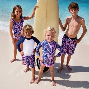 Palm reader fabric is a classic uv protective Shade Critters print. These boys swim shorts are all over navy and pink palm reader print.  They also have a full elastic waistband for a comfortable fit. All Shade Critters sun protective clothing fabric blocks 98% of harmful UV rays, a UPF 50+ rating.