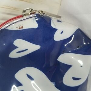 Small cosmetic case with kiss and makeup on front. has a plastic lining
