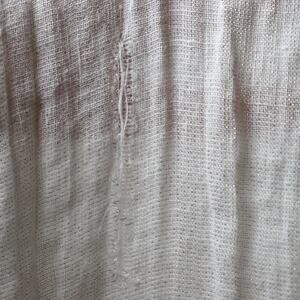 There is a small ~2 inch tear near one end of the shawl/wrap. It’s not noticeable when worn and doesn’t affect the look or function of the piece.