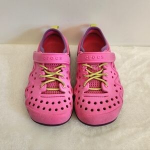 Crocs Barbie Pink Velcro Swiftwater Play Shoes. Childs size 10, neon magenta pink, purple outsole, Crocs logo on sides and straps, light weight, ventilation holes, easy on and off, easy to clean, water friendly, velcro closure, built in yellow elastic ties & heel tabs, durable Croslite material & molded design. Great pre-owned condition!