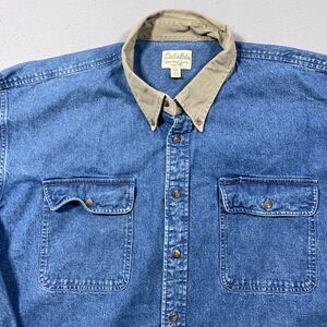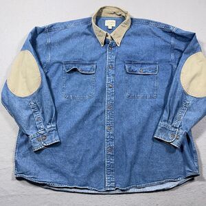 Keywords: Cabelas, Denim shirt, Mens shirt, Button up, Long sleeve, Workwear, Blue shirt, Elbow patches, Casual shirt, Outdoor shirt, XXL, Extra Extra Large