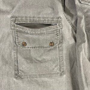 Features: convertible roll-up tab sleeves, 2 zip chest pockets, 2 pleated button chest pockets, raw edge shoulder detail, embossed buttons, Weathered Olive 100% cotton, Gorpcore, Y2K