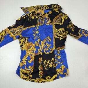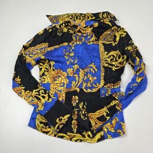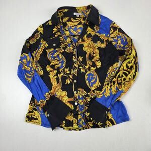 Cache Shirt Womens Medium Black Blue Gold Baroque Silk Stretch Snap Front Fitted