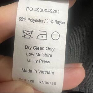 Features: 65% Polyester, 35% Rayon. 3 Front Pockets. 3 Interior Pockets. Dry Clean Only.