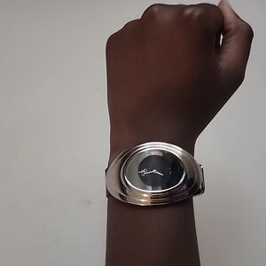 Sleek Calvin Klein Mound watch with a black face and silver oval case. Stylish and modern design. in very good used condition. Slight wear on the strap.