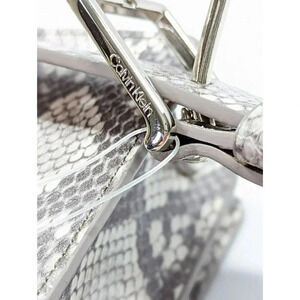 Silver-tone or gold-tone exterior hardware; repeat CK monogram logo embossed design on strap and bag; 7 oblong holes on strap for adjustable fit