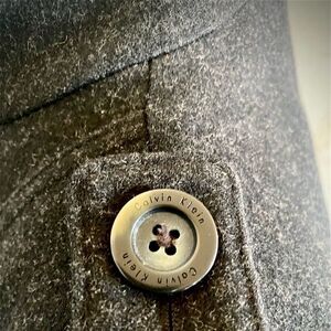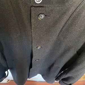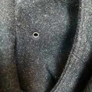 As you can see, this is a timeless 3/4 length trench coat in charcoal gray wool with epaulettes on the shoulders and wrist. It has a banded collar and ventilation eyelets under the arms. There is a bit of damage to the lining and the inside of the pockets, that be easily fixed and the coats shell is still quite lovely.