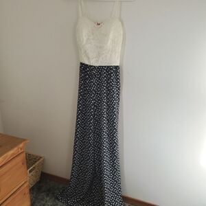 Lacy white spaghetti strap top half and navy blue with white flowers bottom half