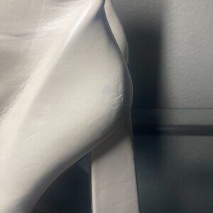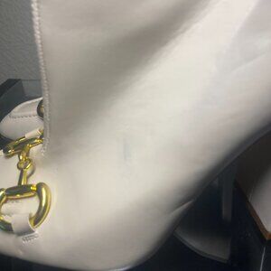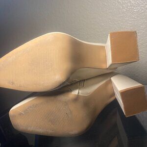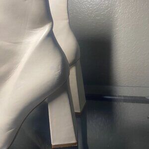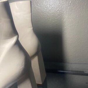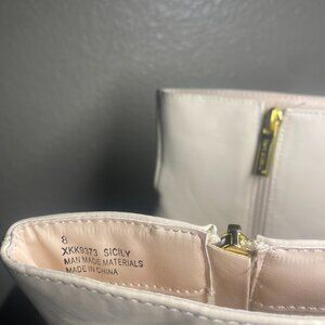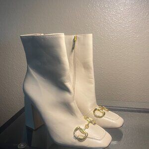 Design Details: The boots feature a square toe and a gold-toned metal chain or horsebit buckle on the top of the foot. A zipper is visible on the side of the shaft.