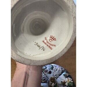The Capodimonte Italy Pedestal Covered Dish is a vintage Italian ceramic piece signed and numbered 1366/76. This multicolored candy dish features an impressed backstamp, a glossy finish, and stands at 8 1/2 inches tall with a width of 6 1/8 inches. Produced in the 1950s, this art pottery piece bears the signature brand of Capodimonte, embodying the Italian theme and craftsmanship of that era.