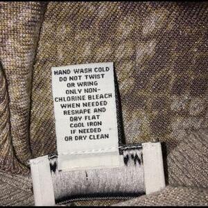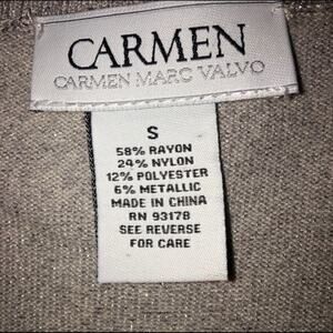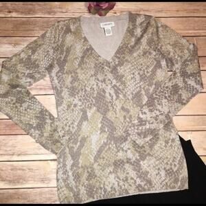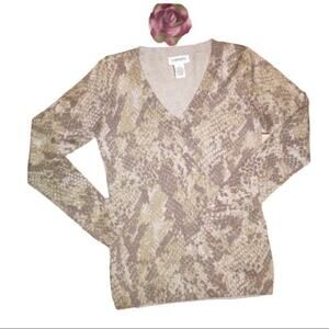 Carmen Marc Valvo knit V-neck fine gauge animal print sweater with metallic thread throughout to give it that added sparkle. Shades of cream, gold and taupe accented with 6% metallic fiber. Rayon/nylon/polyester blend is the perfect blend to provide comfort and lasting shape. Size Small. Measures approximately 16-1/2” pit to pit and 24” shoulder to hem.