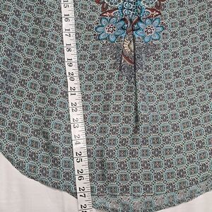 Bohemian, silky feeling blouse in great pre-owned condition. please refer to photos for more details and measurements. smoke-free home. Questions? Leave a comment below!