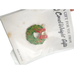Carol Wright Gifts Christmas Wreath Rhinestone Enamel Brooch Pin Gold Tone VTG