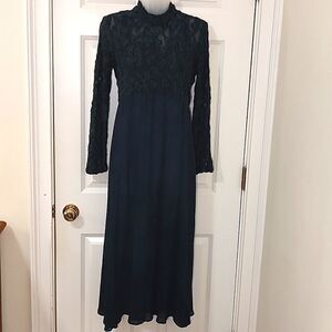 Carole Little green maxi dress with a mock turtleneck, a sheer green lace bodice and a semi-sheer green crinkled rayon skirt.