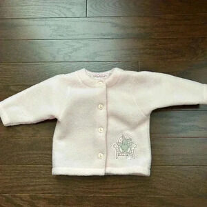 Excellent used condition-vintage. Carter’s fleece like jacket with four buttons closure. No name or size on beret and mittens. Beret and mittens are velvet like material. Jacket is size 6-9 months.