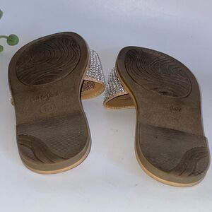 These Cat & Jack sandals feature a dazzling combination of gold and silver hues, perfect for adding a touch of glamour to any outfit. The slip-on design ensures comfort and ease, while the sparkling embellishments on the wide strap offer a chic and stylish look. Ideal for casual outings or dressy occasions, these sandals are a versatile addition to your footwear collection.