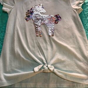 Features a flip sequin unicorn: rainbow body with gold mane on one side and silver body with rainbow mane on the other.