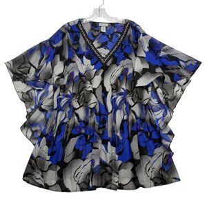Catherines Flutter Sleeve Tunic Top Bold Floral Beaded Neck Flowy Size 1X 18-20W