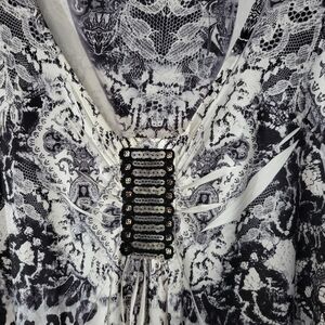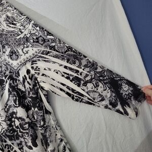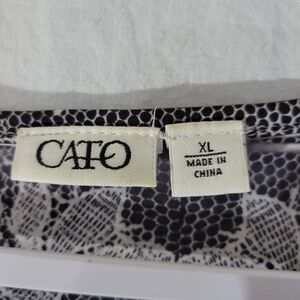 Cato XL long sleeve blouse in striking black and white with a polyester blend for comfort. Features a unique pattern with great fit.