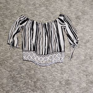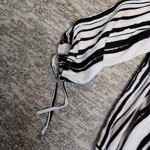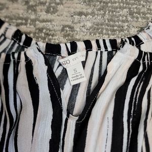 Cato brand blouse in black white and pink striped fabric.  elastic band at tge waist.  open neckline.  elastic band around the arms at the elbows with a tie.  ery comfortable cool and flowy. size small. measurements are 20 inches across the chest from arm pit to arm pit and 17 inches in length from shoulder to hem.  very good pre owned condition