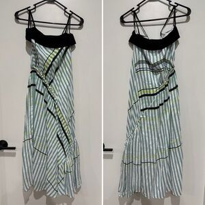 Cedric Charlier Stripe Ruched Midi Dress in size 6. Multicolor striped satin (100% Polyester). Hourglass. Sleeveless. Square neckline. 45" from shoulder to hemline. The straps have been reinforced. Minor signs of use. No notable flaws. Please refer to photos for exact size, details, and condition.