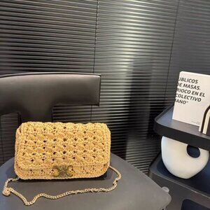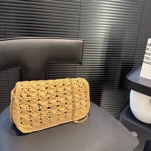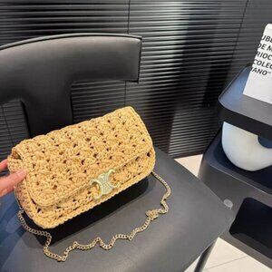 Chic Celine crossbody with woven texture. Elegant beige tone. Gold chain strap adds luxury