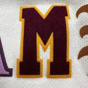 Champion logo on left lower leg in a mix of Old English and Varsity raised lettering