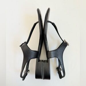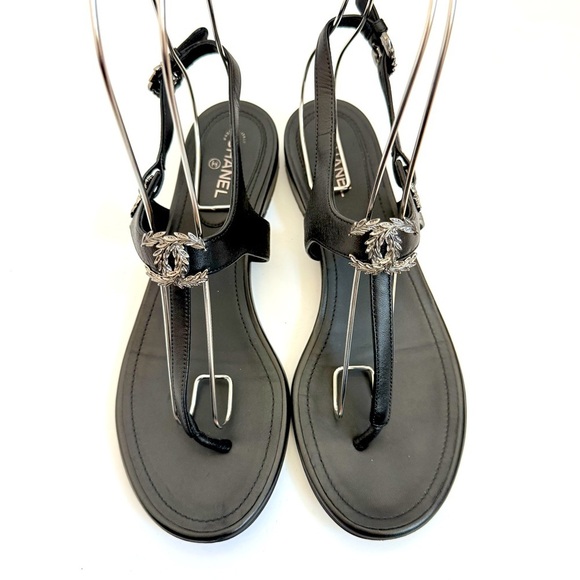 Chanel Black Calfskin Leather Interlocking CC leaf pattern thong flat sandals 38
