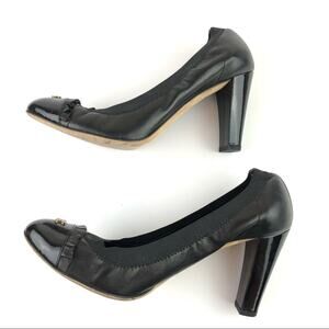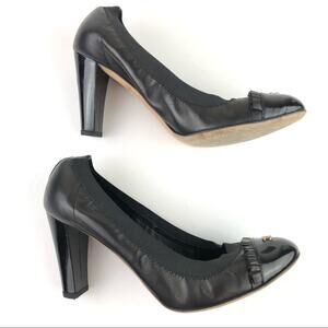 Chanel Black Lambskin Leather Ruffle CC Logo Patent Cap Toe Heels. Authentic.