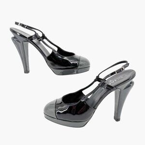 A sophisticated wardrobe staple, these Chanel slingback pumps seamlessly blend classic elegance with a modern edge. The glossy black patent leather upper is contrasted by a gray patent almond cap toe, delivering an effortlessly chic two-tone design. The slingback strap with buckle closure ensures a secure and adjustable fit, while the low platform and high cutout block heel provide both height and comfort. Perfect for office wear, evening events, weddings, or effortlessly elevating casual outfits with a polished finish.