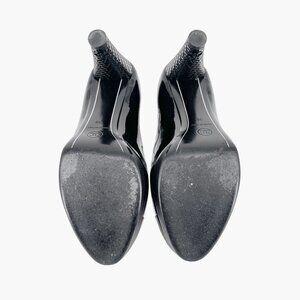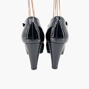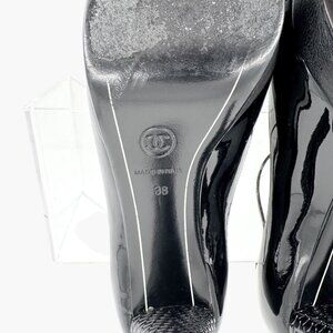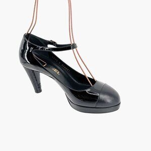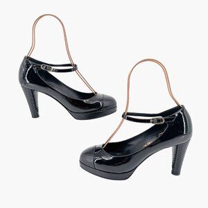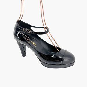 Chanel Platform Pumps Size 38 US 7-7.5 Black Patent Cap Toe Mary Jane Mid Heel