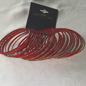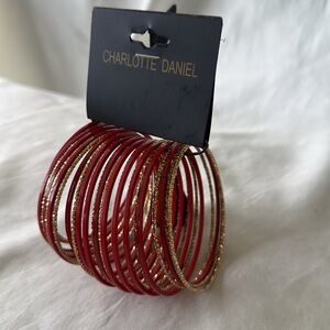 New with tags. Charlotte Daniel Set. Enhance your style with these Red and Gold Thin Bangles Set. These vibrant bangles add a touch of elegance to any outfit. Approx 3” diameter.